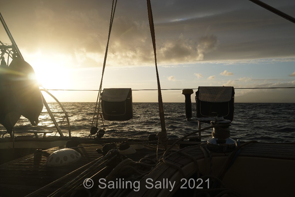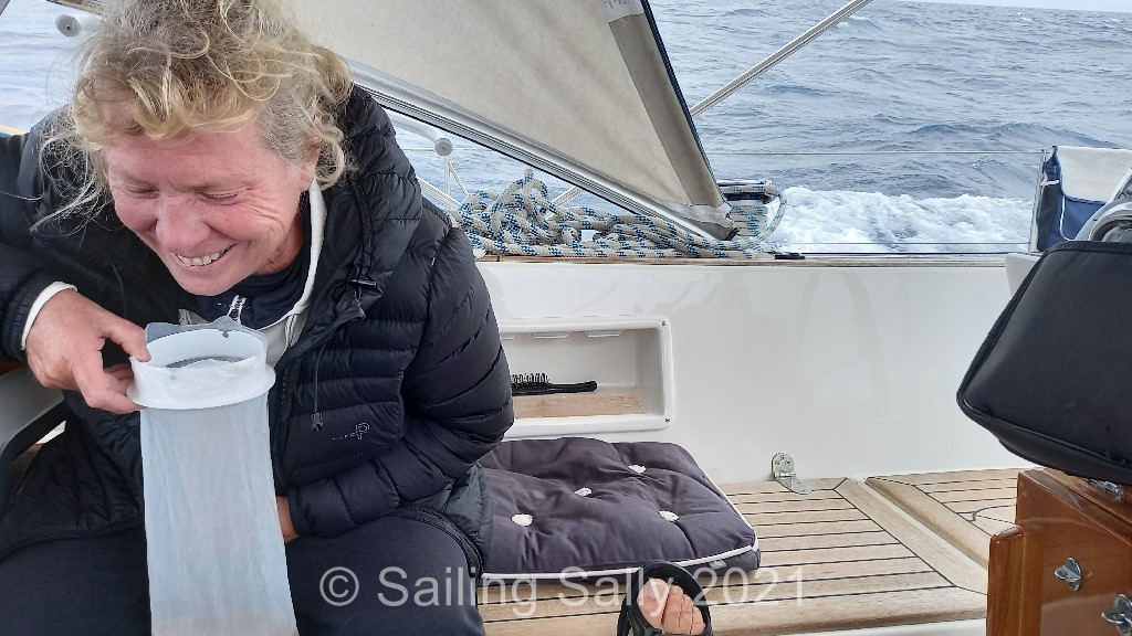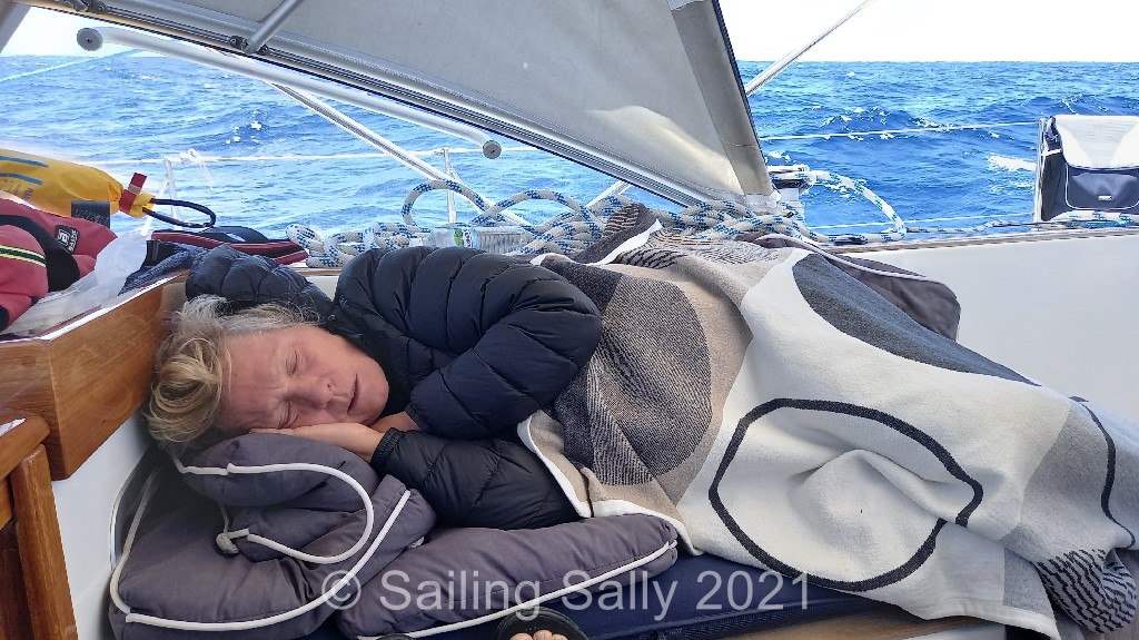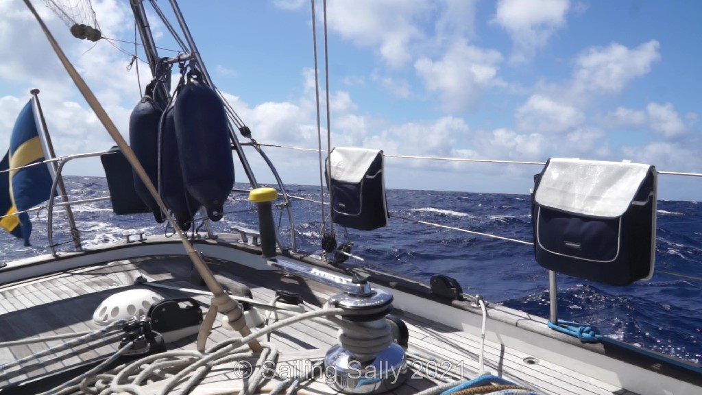Jonas: It has been a windy night (25 knots from north-northeast) with big waves hitting us with terrible force and water is pouring all over the boat each time. Carina is still seasick and despite that, she took a watch last night so I could sleep for a while. The mast pumps a lot when we sail through the steep waves, unfortunately, it is not possible to tighten the aft lower shrouds right now, it has to wait until the wind and the waves decrease. To reduce the pumping, we fall off a little so that the waves come more from the side and do not stop us as much.