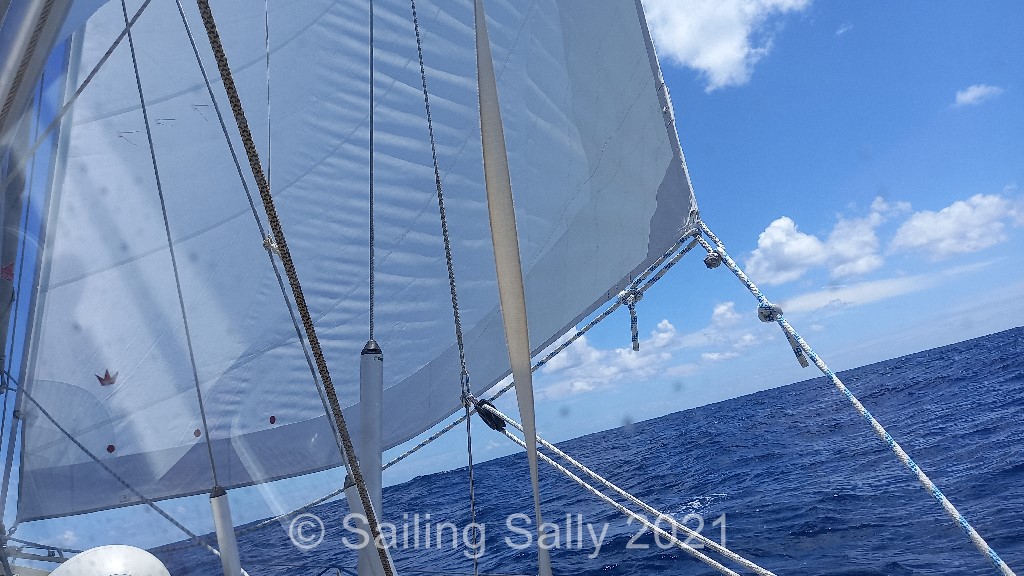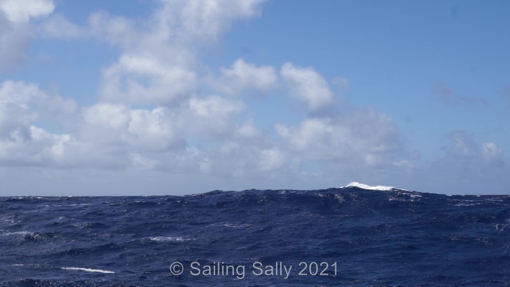 During the day, the wind decreased to 10 knots, and the waves were smaller and not as steep as before. Then we took the opportunity to lower all the sails and motored slowly straight towards the waves while I tightened the aft lower shrouds.