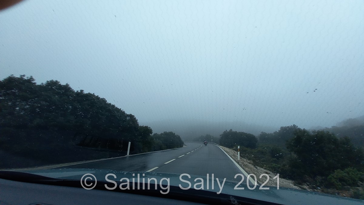 När vi närmar oss Ronda som ligger 700 m över havet, kommer vi in i de låga molnen och det blir dimmigt och vägen blir våt. Skönt att det är plusgrader så vi slipper halkig väg, det är halt nog nu när den är våt.