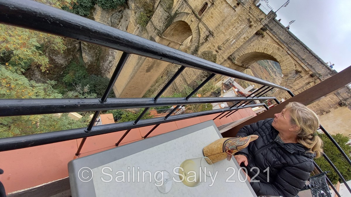 Efter allt promenderande i Ronda, besöker vi en av restaurangerna på branten vid bron. Härifrån har man en fantastisk utsikt mot ravinen, bron och slätten nedanför.
