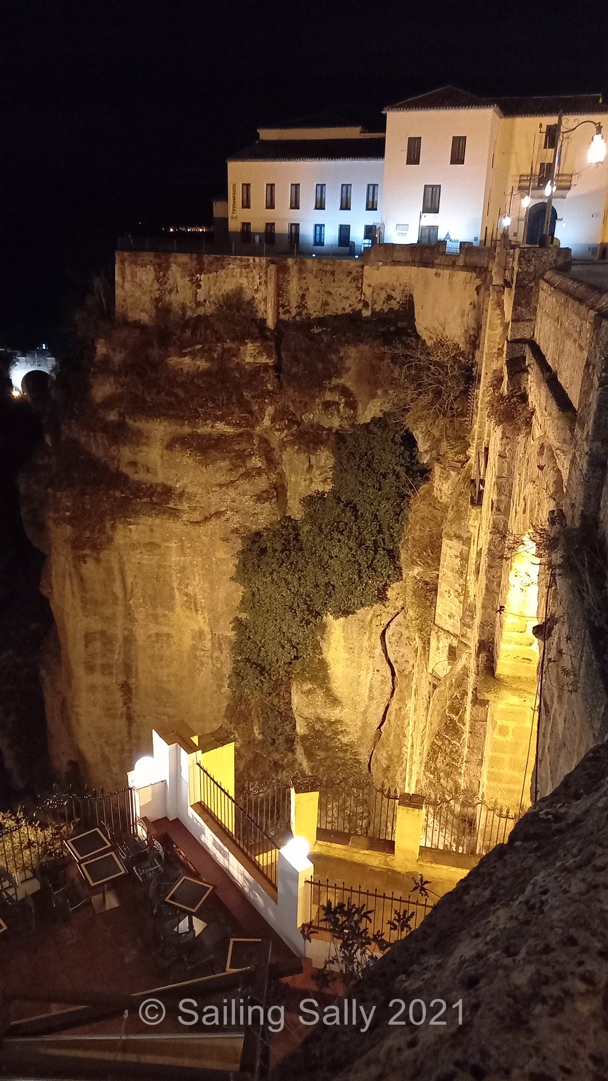 När vi kommer till Ronda kör vi först igenom de nyare stadsdelarna innan vi kommer in i centrum där vi ska bo. Den här delen av staden ligger vid en tvärbrant bergskant med en hissnande utsikt över slätten som omger staden nästan 200 m nedanför. När vi har checkat in på hotellet och ska börja vår upptäcktsfärd i Ronda, har molnen som tur är lättat och solen skiner på Ronda.