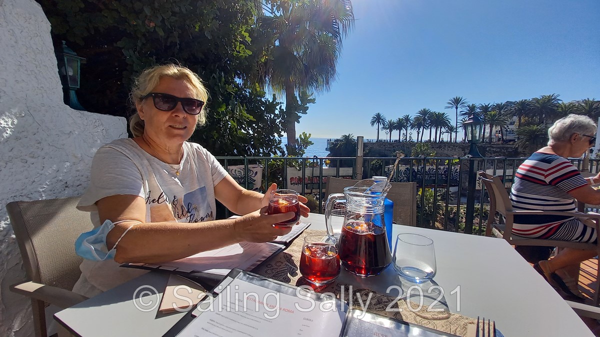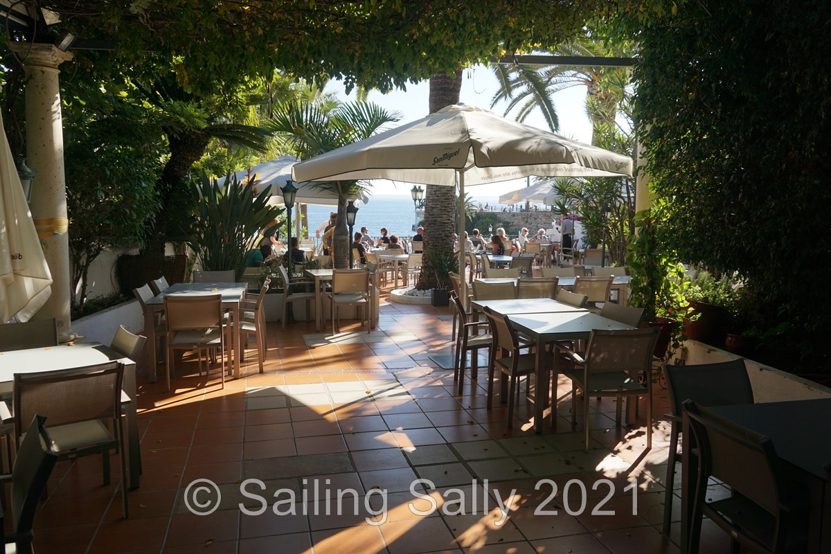 På andra sidan huset ligger en fantastisk terass inramad av växter och med en härlig utsikt mot Europas Balkong, havet och stranden nedanför. Vi har en underbar lunch och blir sittandes alldeles för länge för att hinna med att se mer av stan innan det är dags att hitta en taxi som kan köra oss tillbaka till marinan.