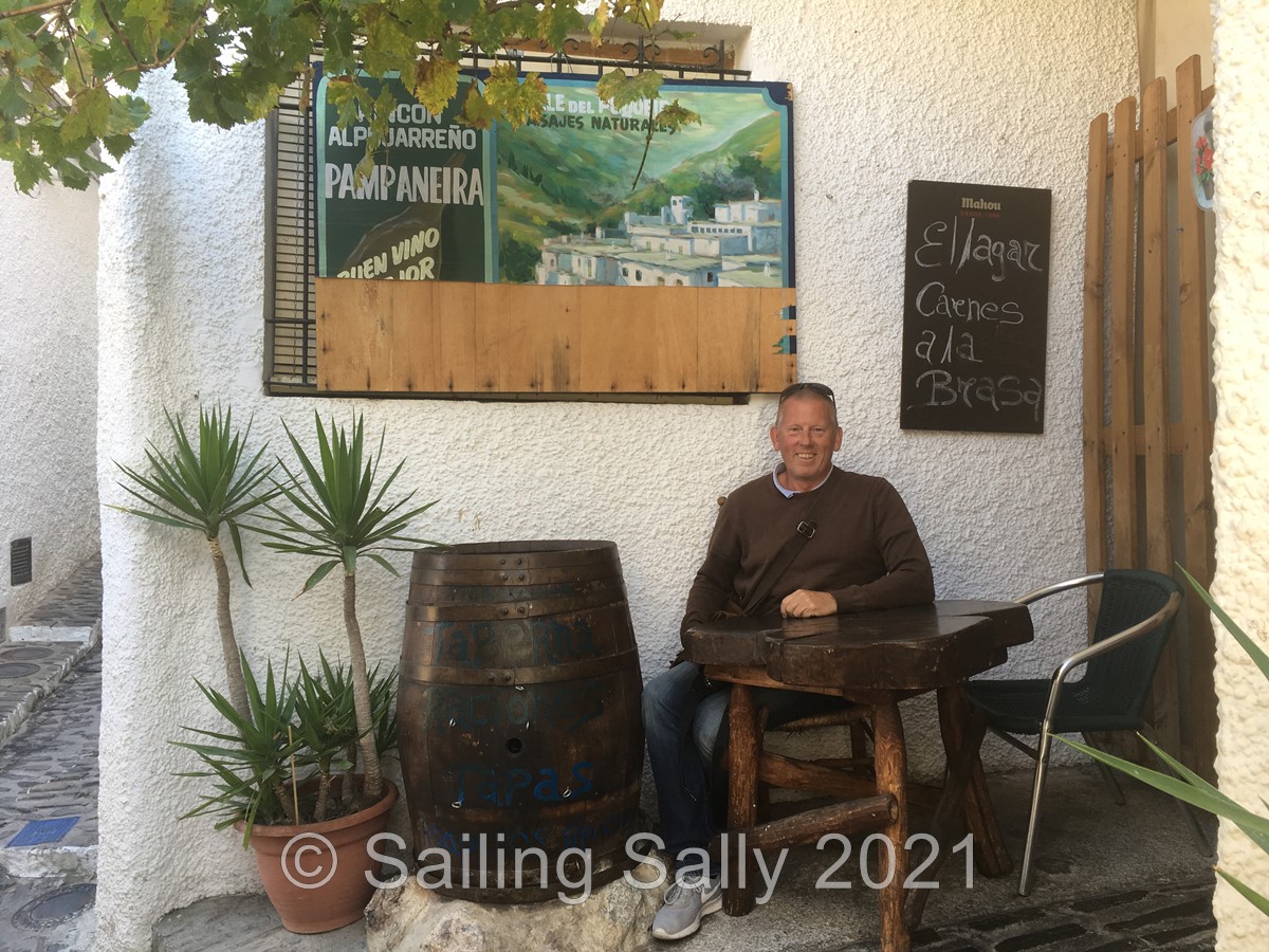 When we get to Pampaneira it’s time for lunch and we are so lucky that it is a small paradise village with some open restaurants and sales of dried ham and rag rugs in bright colors. There are some restaurants in the village square and we choose the one that has vacant tables out in the sun.