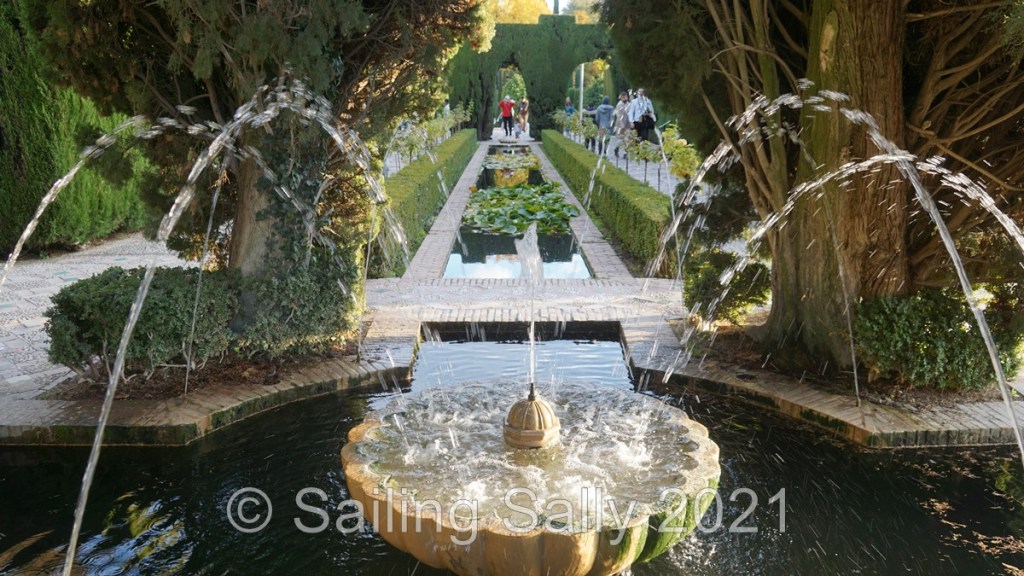 Part of the Alhambra is called General life, here it was thought that one would live a normal life, outside the palace. To get here you have to cross a bridge over the road we went up to the Alhambra earlier today. General life has beautiful gardens, buildings, and promenades. Ponds and fountains are supplied by water from the river that flows through Granada.