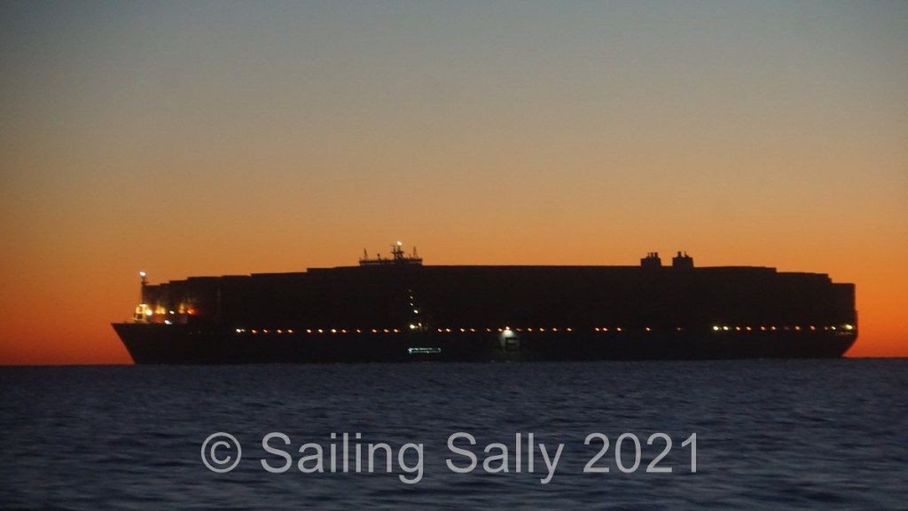 We leave Gibraltar at dawn to reach Cadiz before dark. When we get past the Gibraltar cliff, we met this 400 m long container ship that can carry over 20,000 containers.