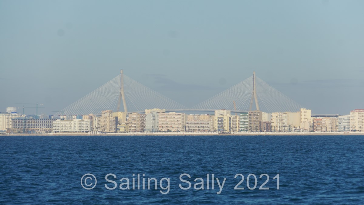 To get to the marina out at Puerto America, we have to round Cadiz on the north side past the old city with its old fortification at the far end of the cape.