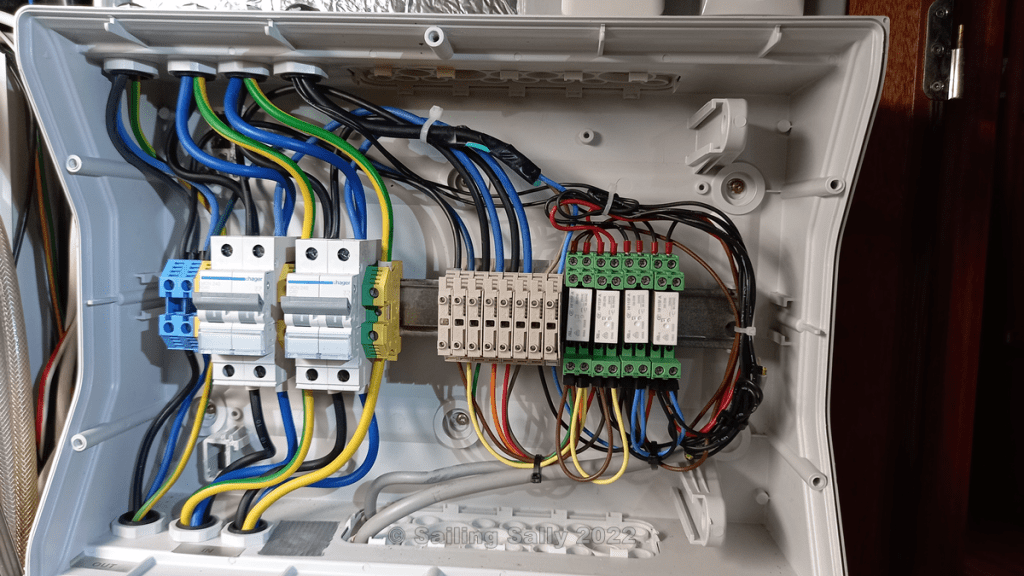 In addition, there is a connection to the boat’s ground point from the minus rail in Cabinet 1. That cable is 4m long. The current in that cable is zero as long as everything is in order with the boat’s electrical system.