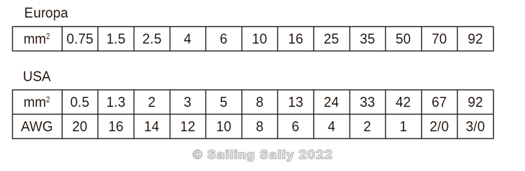 Cables are manufactured with standard areas according to the table below. In Europe and many other countries, a metric standard is used where the area is specified in mm2. There are thicker cables in the standard, but they are impractical to install in a pleasure boat, so I have not included them in the table. If the thicker cable is needed, use 2 pcs of a thinner cable. If the cable dimensioning says that the cable should have an area of 130 mm2, use 2×70 mm2.