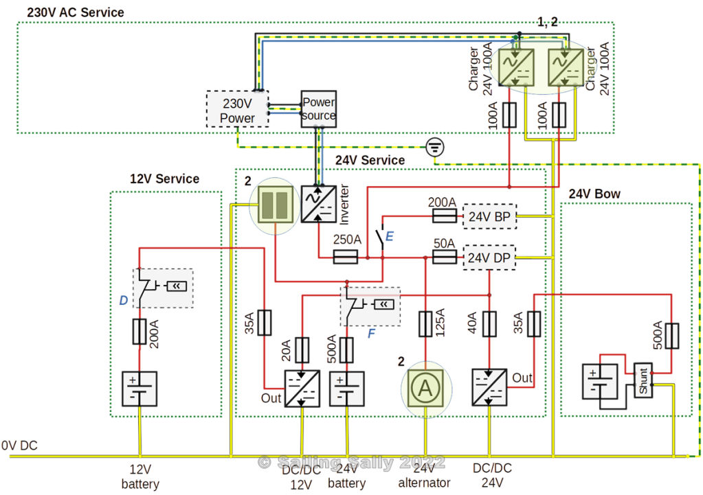 In this picture which is from Electrical Systems, Part 3 – Subsystems, the circled chargers are marked with 1, an example of using 2 parallel chargers to be able to charge the battery bank for 24V Service with 200A when the diesel generator is running. It is not so important to be able to charge with 200A when connected to shore current, because that connection can usually be connected for a longer time.