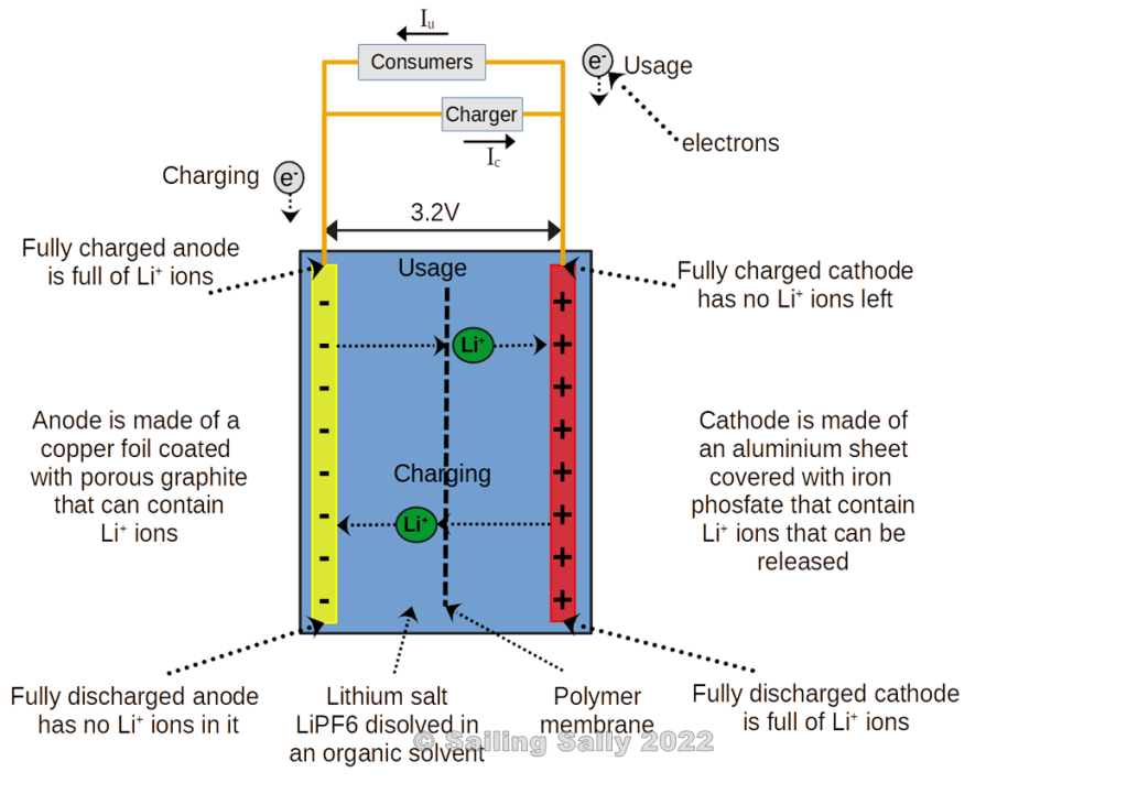 - The positive terminal consists of a layered metal oxide that can store lithium ions, e.g. iron phosphate as in LiFePO4 batteries.