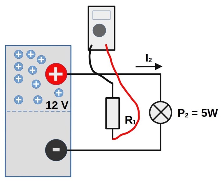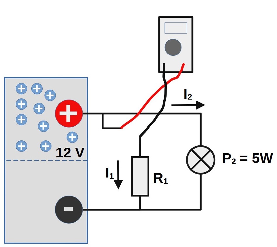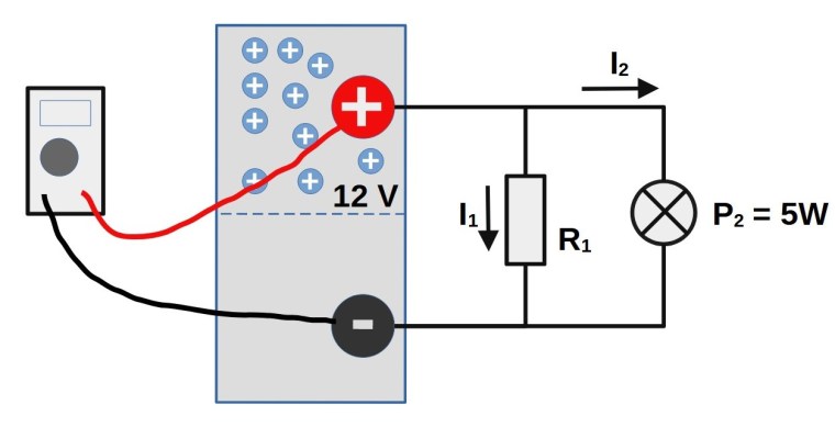 - A lamp that is connected in parallel with the consumer. The power of the lamp is P 2 = 5W and draws the current I 2 A.