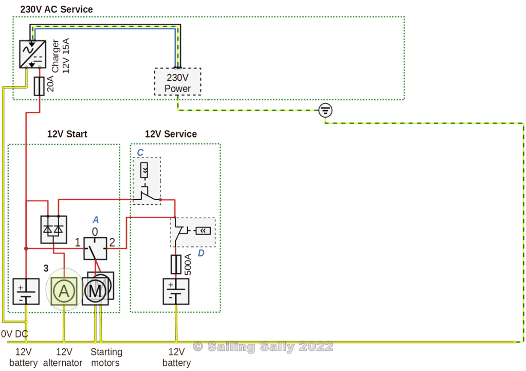 Generatorn på motorn lämnar ström till både 12V Start och 12V Service via batteriseparatorn. När batteriet i 12V Service är uppladdat kopplar batteriet bort laddningen med hjälp av den fjärrstyrda strömbrytaren vid C som också är ansluten till nätverket. Vid denna bortkoppling kan det uppstå något som kallas ”Load dump”. I Elsystem, del 3 – Generator och laddning, kan du läsa mer om detta.