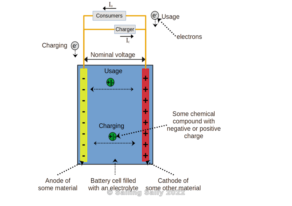 Laddningsbara batterier i en segelbåt bygger på att elektrisk energi lagras som kemisk energi i batteriet när det laddas. Vid användning av batteriet omvandlas den lagrade energin till elektrisk energi.