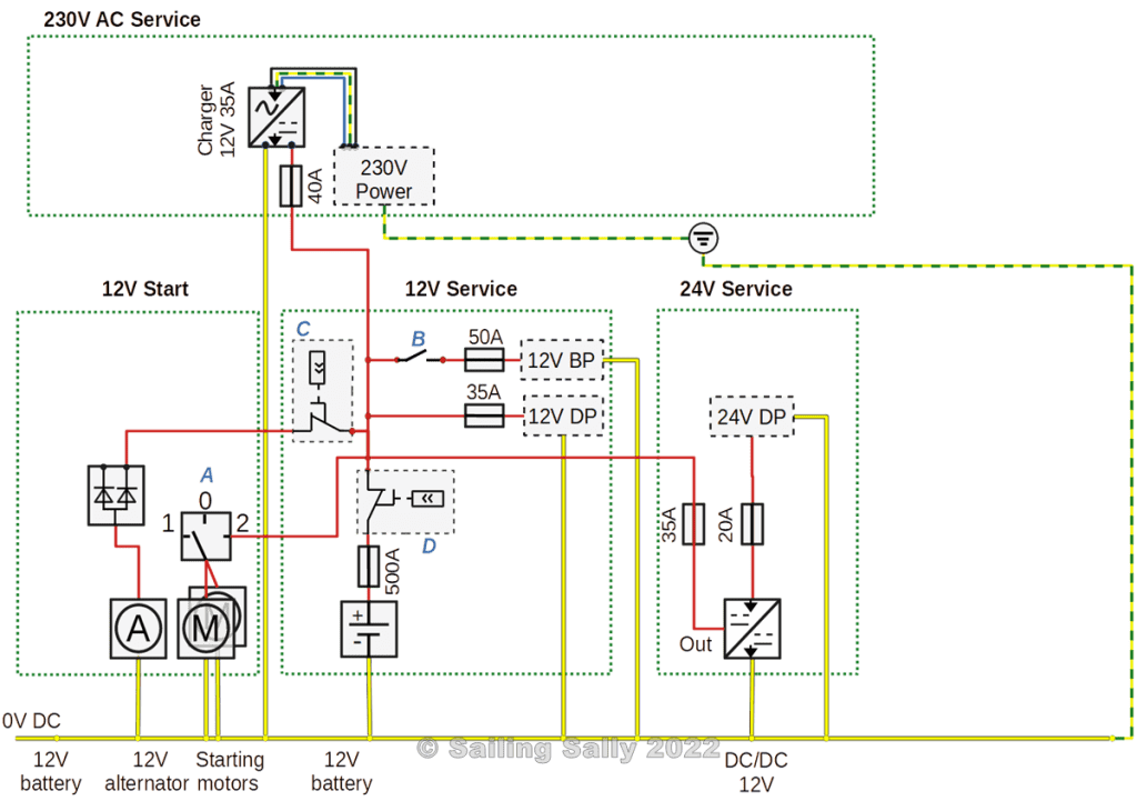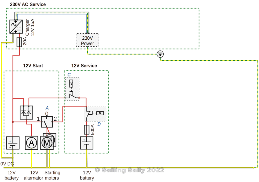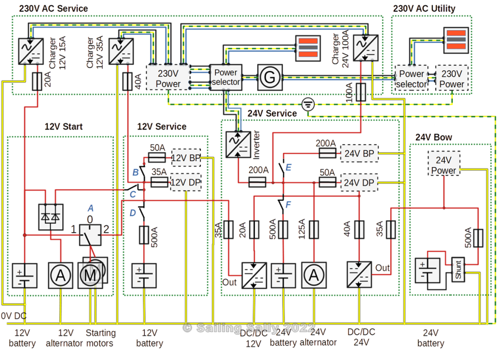 Elverket A är anslutet via B, en säkring och jordfelsbrytare till Power selector vid H (utrustning som väljer vilken källa för 230V AC som ska kopplas in). Elverket är även anslutet till punkten N i 230V AC Utility.