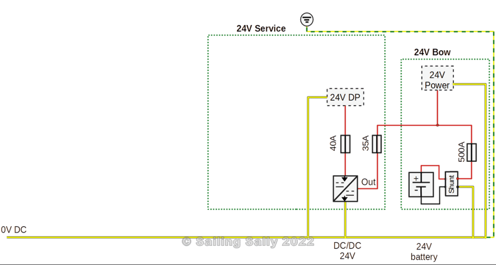 Det kan ju hända att man använder bogpropeller och ankarspel samtidigt, så för att inte ställa allt för stora krav på effektuttag ur bog-batterierna, är ankarspelet inkopplat i 24V Service. Batterierna i 24V Service klarar av att leverera ström utan att spänningen sjunker under 24V, speciellt som man antagligen även kör med motorn när man använder ankarspelet och därmed tillför ström från 24V generatorn.