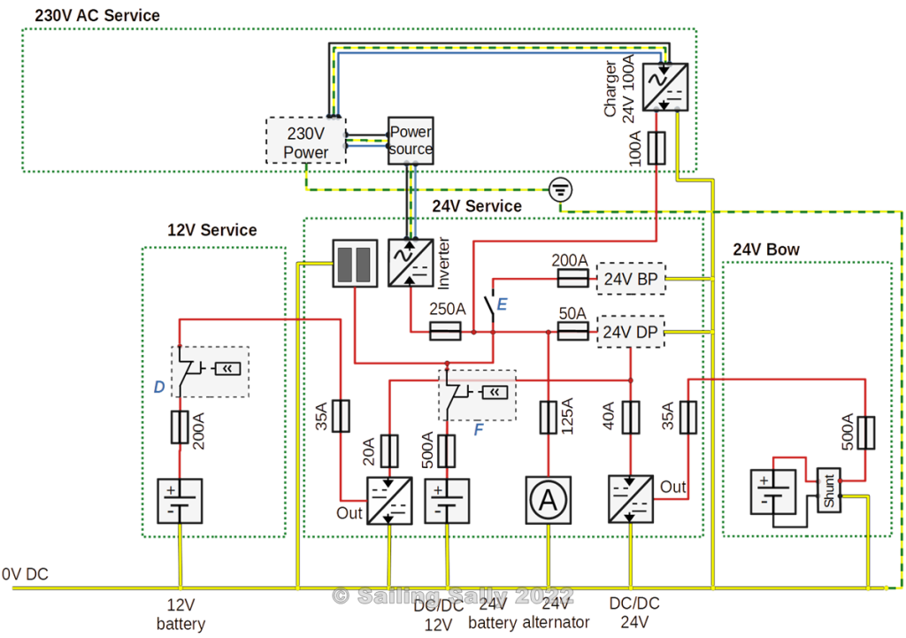 - Strömförsörja utrustning som drivs av 24V. Utrustningen finns på två huvudkretsar, en för utrustning som ska ha ström hela tiden, Direct Power (DP). Utrustning som bara ska kunna vara igång när man är på båten finns på kretsen Breaker Power (BP).