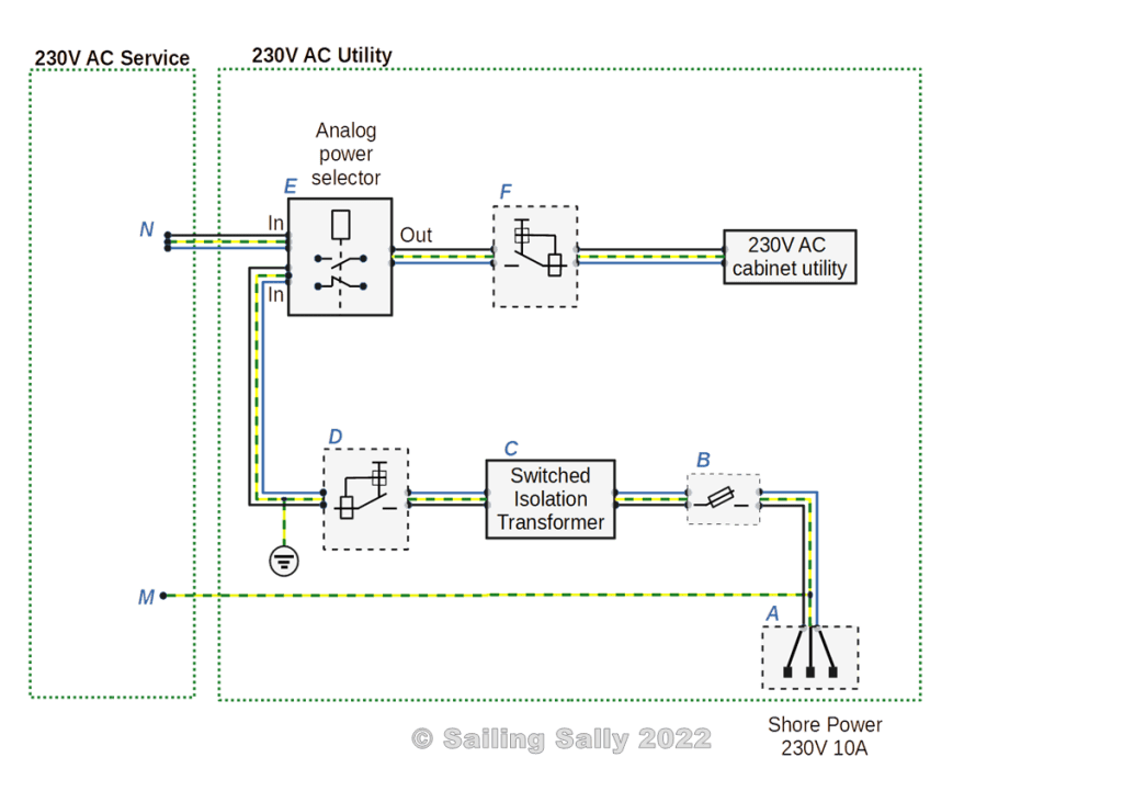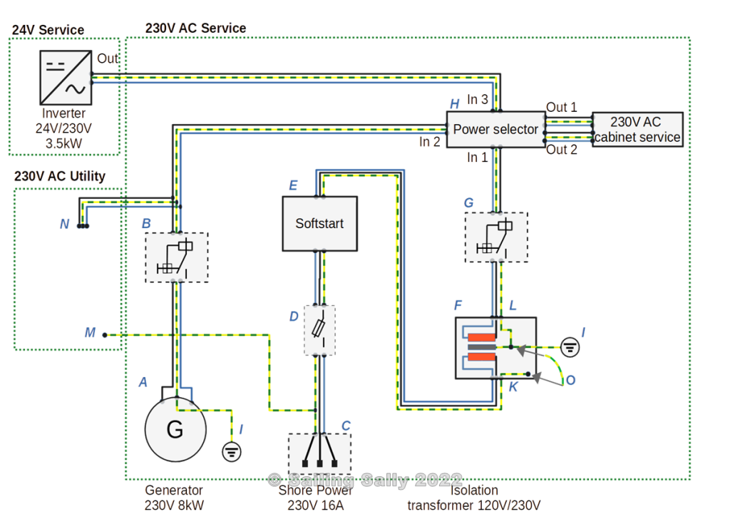 Anslutningen för landström C, går via säkringen D, till en startströmbegränsare E (soft start) eftersom batteriladdare och varmvattenberedare kan göra att det går åt mycket ström direkt. Därefter vidare till den primära sidan (K) av en isolationstransformator F. Isolationstranformatorns sekundära sida (L) är ansluten till jordfelsbrytaren G som i sin tur ansluter till Power selector vid H.