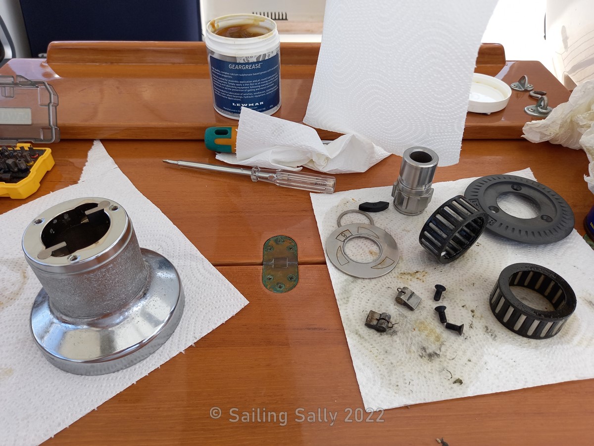 About once a year I take the winches apart for overhaul with cleaning, greasing and possibly changing the springs for the stop catches. We also go over all stainless details and remove rust that has formed. Often the rust has discolored the substrate, which also needs to be cleaned. If there is a lot of rust around the fitting, I usually remove it and clean also under the fitting and reseal so that it doesn’t rust on the underside again.