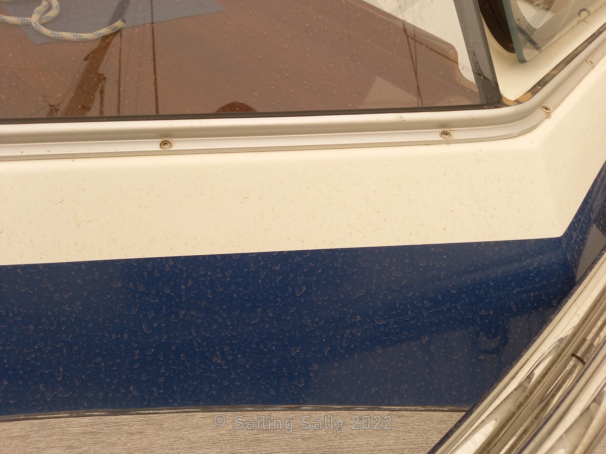 Vi passar också på att tvätta, polera och vaxa överbyggnaden som tar mycket stryk av sol och salt. Efter varje segling spolar vi bort salt från hela båten. Det gör att både överbyggnad och beslag håller sig fina längre.