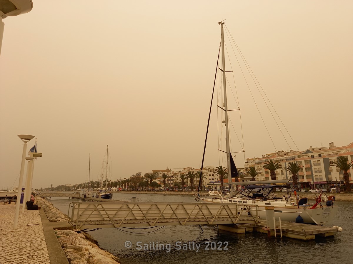In conjunction with strong southerly winds from Africa, the wind also carries with it large amounts of fine sand which causes the air to be colored a tone of sepia brown. At one point there was a lot of sand in the air for several days straight and the whole boat got a thin layer of fine sand. Then it is not enough to flush with water to remove it. You also have to scrub with a brush or cloth. The sand also sticks to the mast, sails, ropes, blocks and battens, which also need to be cleaned to reduce wear and tear on the equipment.