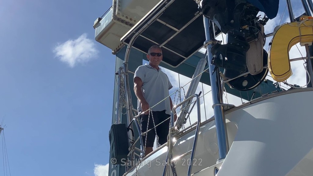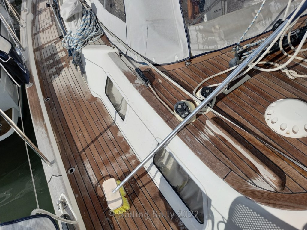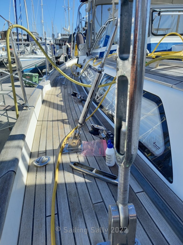 To be able to rinse properly, I bring the water hose up. What I didn’t think about is that it gets quite heavy and that creates a lot of stress on the hose connections. The hose holds together for a while, but eventually gives up and decides to let go of the flush nozzle. It’s the kind of flexible hose that contracts when the pressure goes away and the end flaps wildly and the water sprays uncontrollably in all directions on the way down. Down on deck, it settles down and targets the boat neighbor’s skylight, which is slightly open.