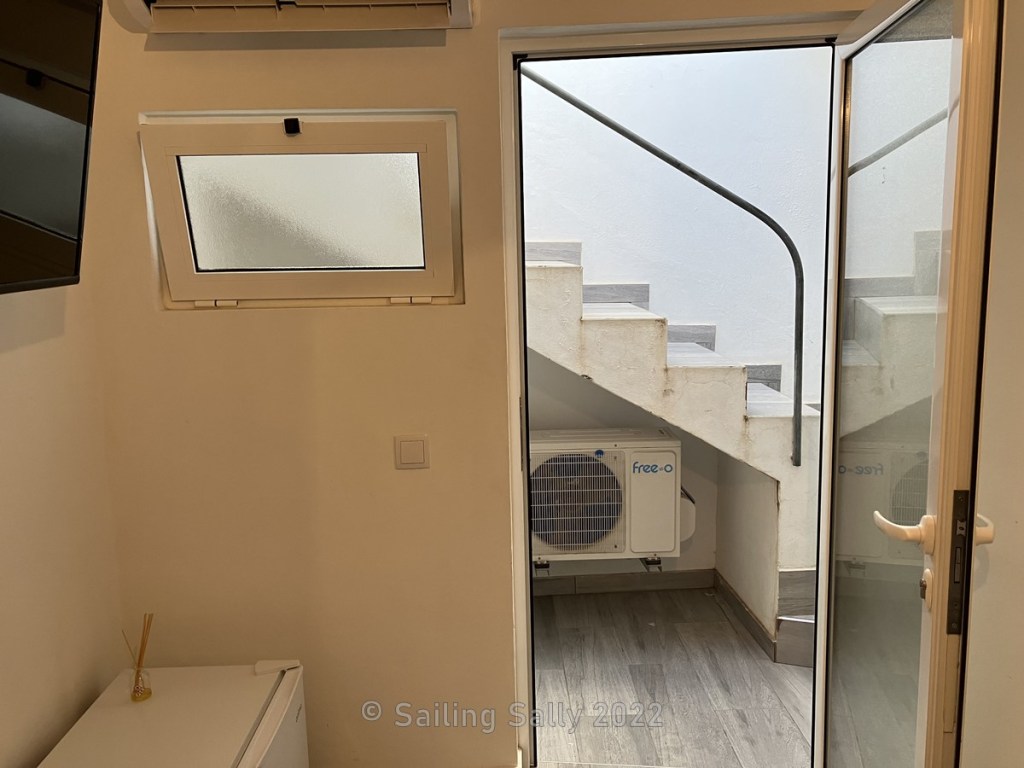 For the first few days in Lagos, we have rented a small room from New Village Guest House. When we get there, it turns out that the room does not correspond to the description on Booking.com that provided the room. We contact the landlord and request a room that corresponds to the one we rented, i.e. with a balcony, window and double bed. He says that that room is rented out to someone else. The room we got instead has no windows or balcony, instead of a double bed there is a bunk bed because the room is so narrow. The door to the room is made of glass and faces a stairwell where there are 3 AC units humming under the stairs. It is damp and smells of mold in the room, ugh, we don’t want to sleep here!