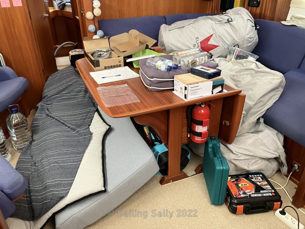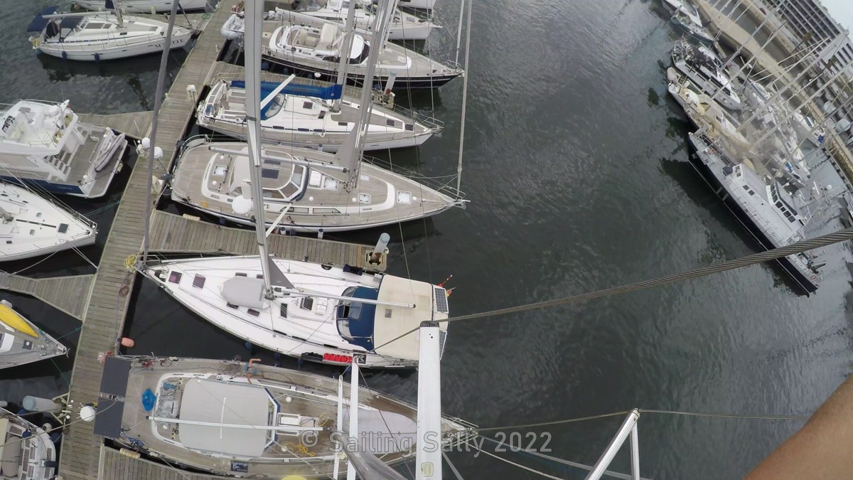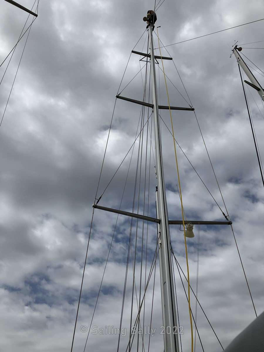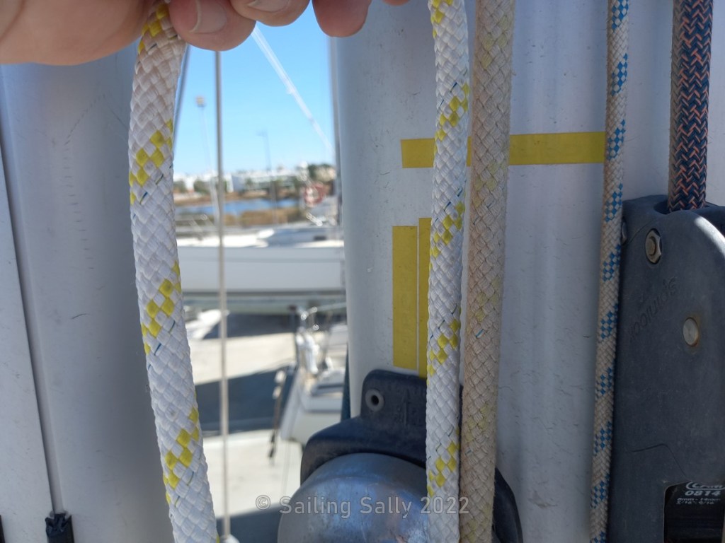 When we left the boat at the yard before the summer, we pulled all the halyards (ropes with which you hoist the sails are called halyards) inside the mast and the part that was unprotected we placed in a box under the dinghy which is stored upside down on the foredeck. We had also removed all other ropes and loose rigging to protect them from sand. The only ropes we had to wash were the thin ropes we attached to the cases to be able to pull them back up from the mast without having to climb the mast top.