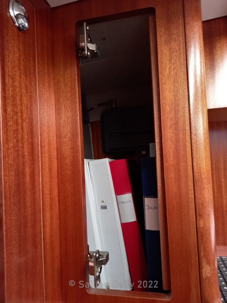 The cabinet doors in the boat have modern spring-loaded hinges, the kind that usually sit on kitchen doors. Unfortunately, they don’t work so well if the cabinet door is small. On the one hand, the door becomes very difficult to open, and on the other hand, the hinges stick out in the door opening and it is easy to tear yourself on them. It also means that they are in the way of larger items you want to store in the cupboard.