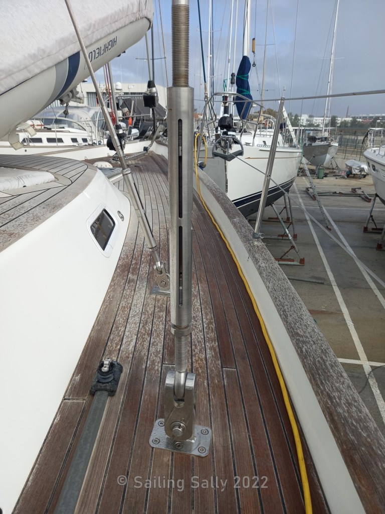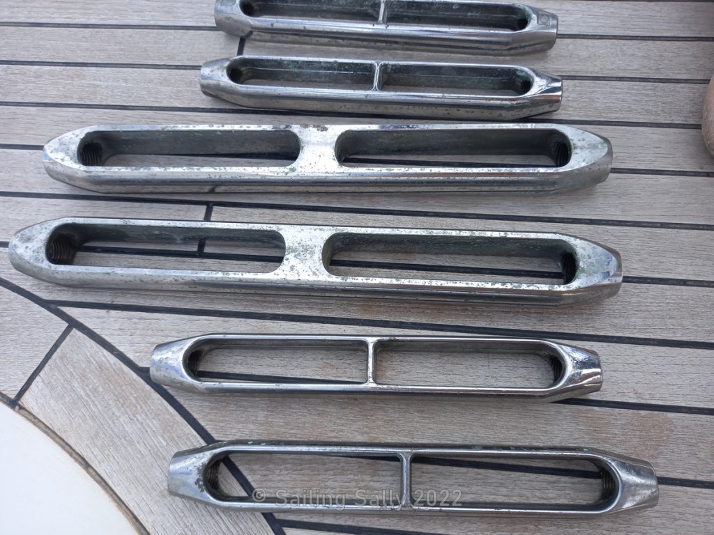 The rigging screws have begun to corrode and the chrome plating has loosened in places and Seldén, who supplied the rig, is replacing them free of charge with a new model of stainless rigging screws that do not need protection. The new rigging screws are locked with lock nuts instead of split pins and this means that we don’t have to use the large aluminum rigging screw covers. There are both pros and cons with protection over the rigging screws. On the one hand, the sails and booms probably wear less when the covers are on, on the other hand, it is not as easy to check the rigging screws and the wire terminals under the covers, which were hard to lift up. They used to stick to the deck bracket of the stay.