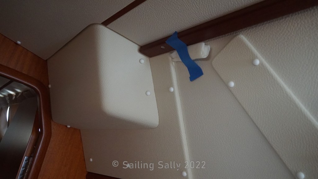 As we wash the superstructure, we discover that the leak at the navigation site comes back to life and a it requires a lot of detective work to find where the leak is. We suspect that water is leaking in via some screw that fastens the air vent or some fitting in the ceiling above the navigation site and then further inside the false ceiling out at the window. I re-seal the air ventand fittings and finally no more water comes out, nice.