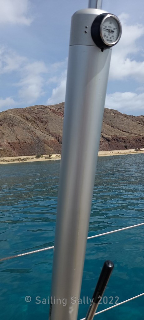 Sista dygnet avtog vinden till under 10 knop och Carinas sjösjuka gick över. När det blåser under 10 knop akterlig vind, kör vi oftast motor eftersom Sally bara gör omkring 2-3 knop då. Så de sista 100 distansminuterna fick motorn jobba och vi kom fram till Porto Santo med fulladdade batterier.