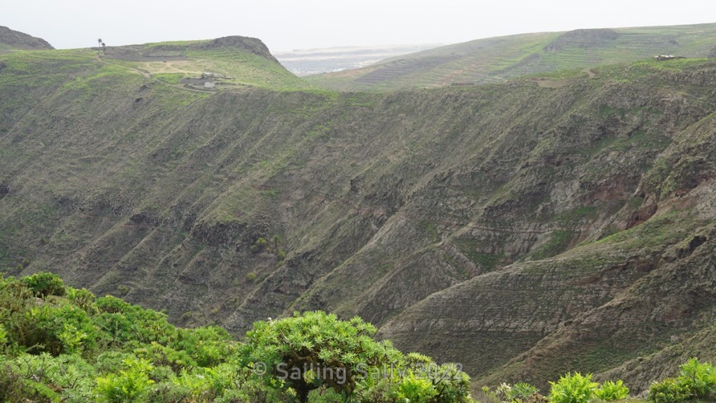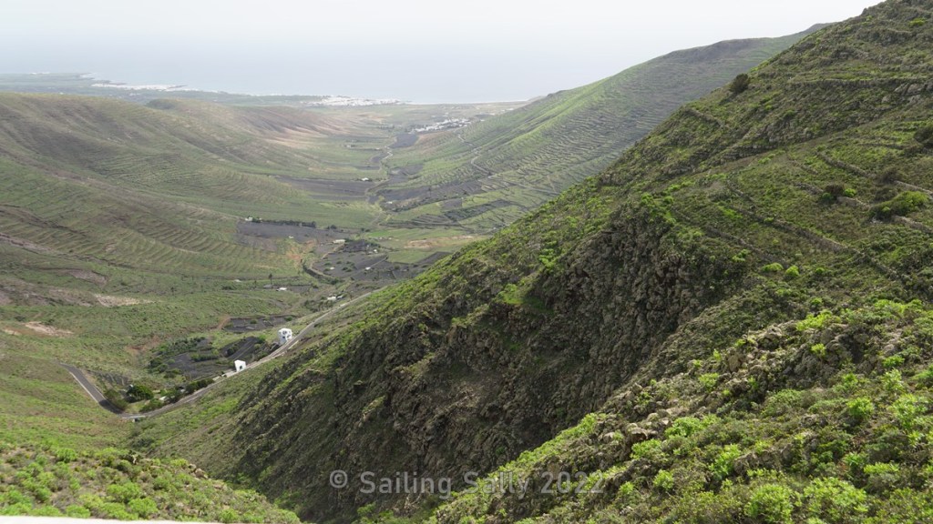 In the north of Lanzarote, the landscape has changed character and is much greener and more mountainous. From the road on the mountain side, we have a nice view of green valleys that are watered by water vapor from the Atlantic. On this day, we could see how the sun lights up the water mist that blows in over land.
