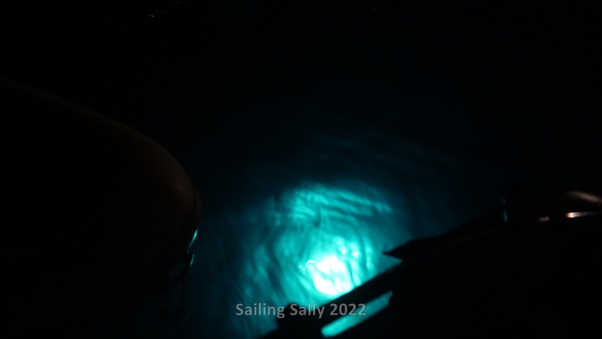 Late one evening we see a light down in the water approaching the boat, as it gets closer, it splits into two and then a third light lights up under the water.