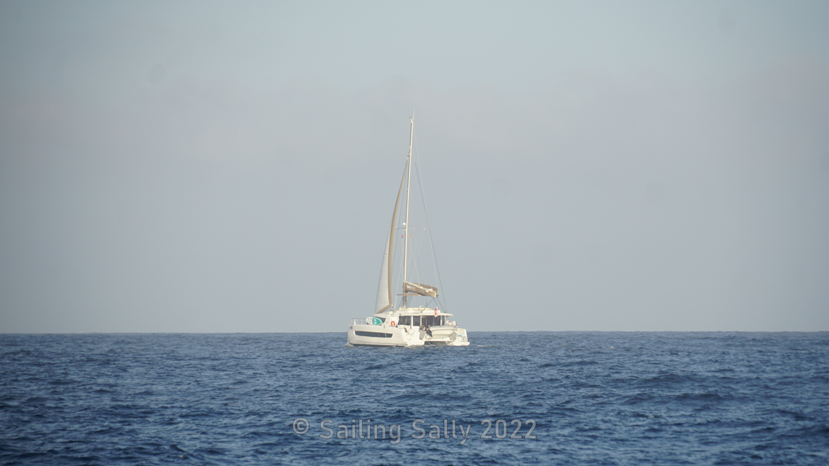 Vi är inte enda båten som ska till Las Palmas idag. Vi får sällskap av katamaranen Pop Corn som också motorseglar, men bara med förseglet och vi ser ut att sakta komma ifatt dem.