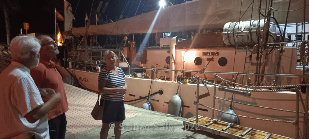 Falken är ungefär 33 m lång (100 foot) och väger 225 ton. Den största segelyachten i hamnen just nu är 45 m lång och väger 324 ton!