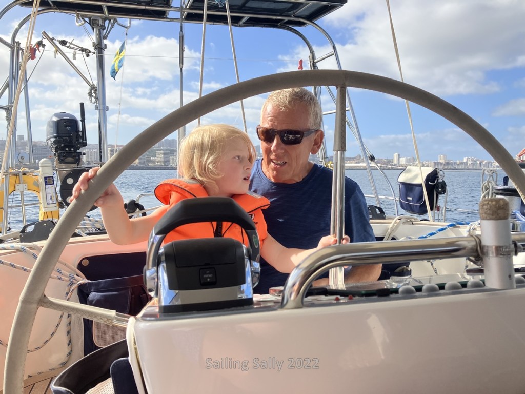 One afternoon it is time for Sally to release the moorings so that Sixten and Klara get a little ride and the chance to steer Sally when we leave the harbor. Outside the outermost pier there are several meter high waves and without a sail Sally rolls a lot, so we turn back into calmer water inside the pier. Always nice to leave the dock for a boat trip.