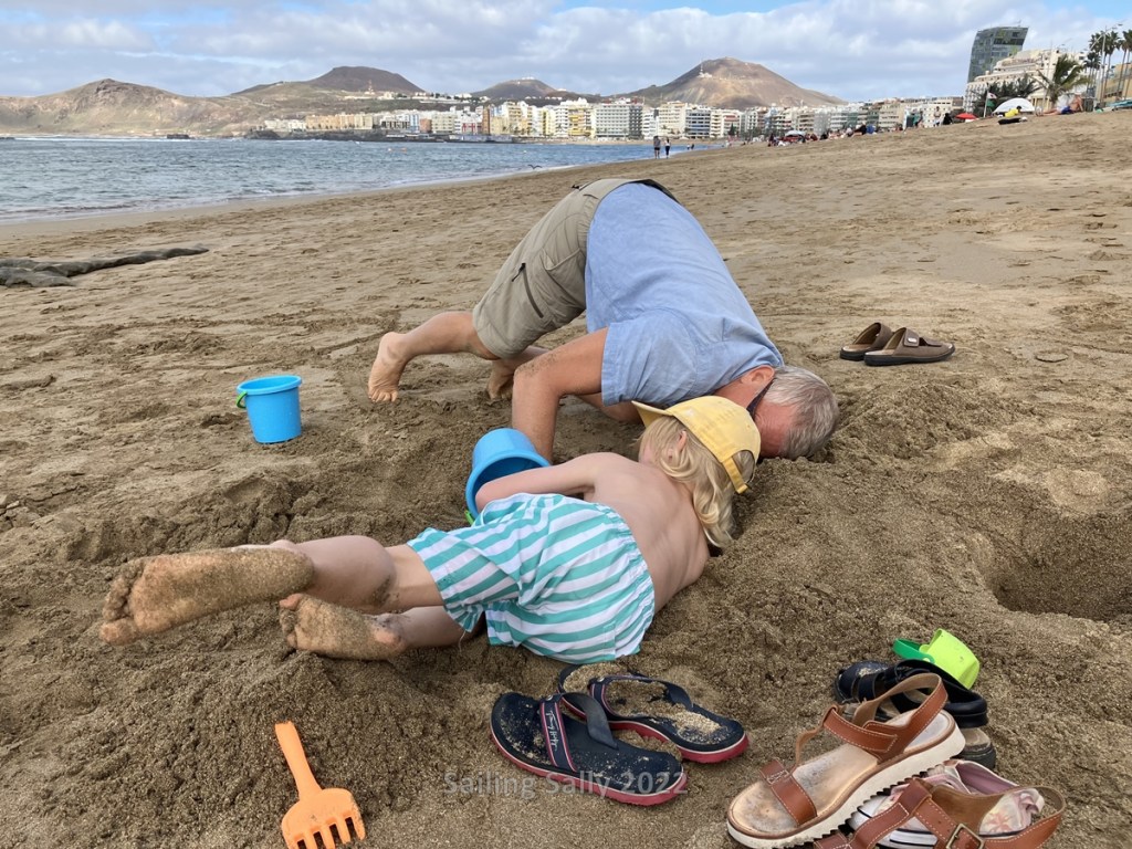 There are quite big waves most of the times we were at Canteras and therefore it was too dangerous for the kids to swim by themselves. With grandfather’s help, Sixten dared to try swimming in the waves, which were sometimes bigger than both him and grandfather. We also try building in the sand, although not as big as the Christmas sand sculptures.