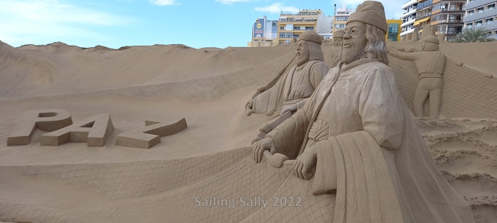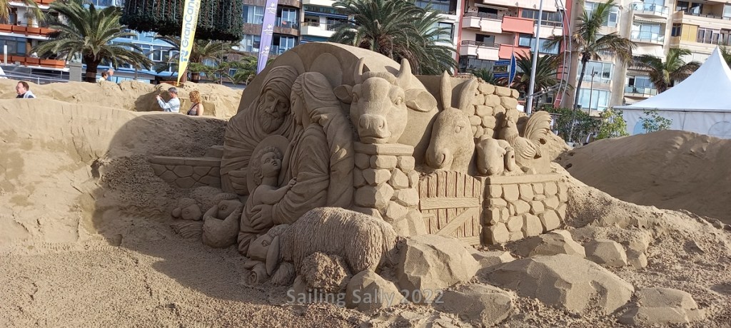 From the boat we are within walking distance to Canteras, the large and centrally located beach here in Las Palmas. Now they are preparing the traditional Christmas exhibition on the beach where a number of sand artists sculpt large sand works of art. Every time we pass there, we stop to see how the sculptures are growing.