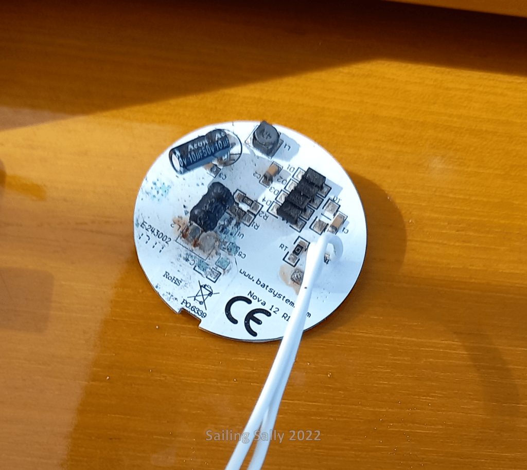 But this time it wasn’t because of that, but because moisture got on the back of the lamp’s circuit board. I suspect that water has entered through the goose neck pipe for the mast cables and has run down the cables and finally dripped onto the top of this lamp’s circuit board.