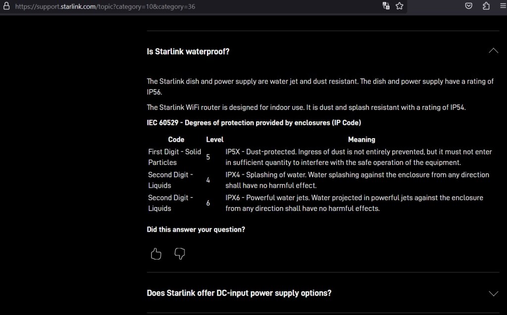 När man läser om Starlink Roam och den här antennen, står det att IP-klassning är IP54, vilket gör att antennen verkar vara lite känslig för hårt regn och vattensprut. Men när jag läste mer om IP-klassning av de olika delarna står det att den är IP56, dvs tål hårt vattensprut, d.v.s samma IP-klassning som den stora fast antennen som är avsedd för maritimt bruk.