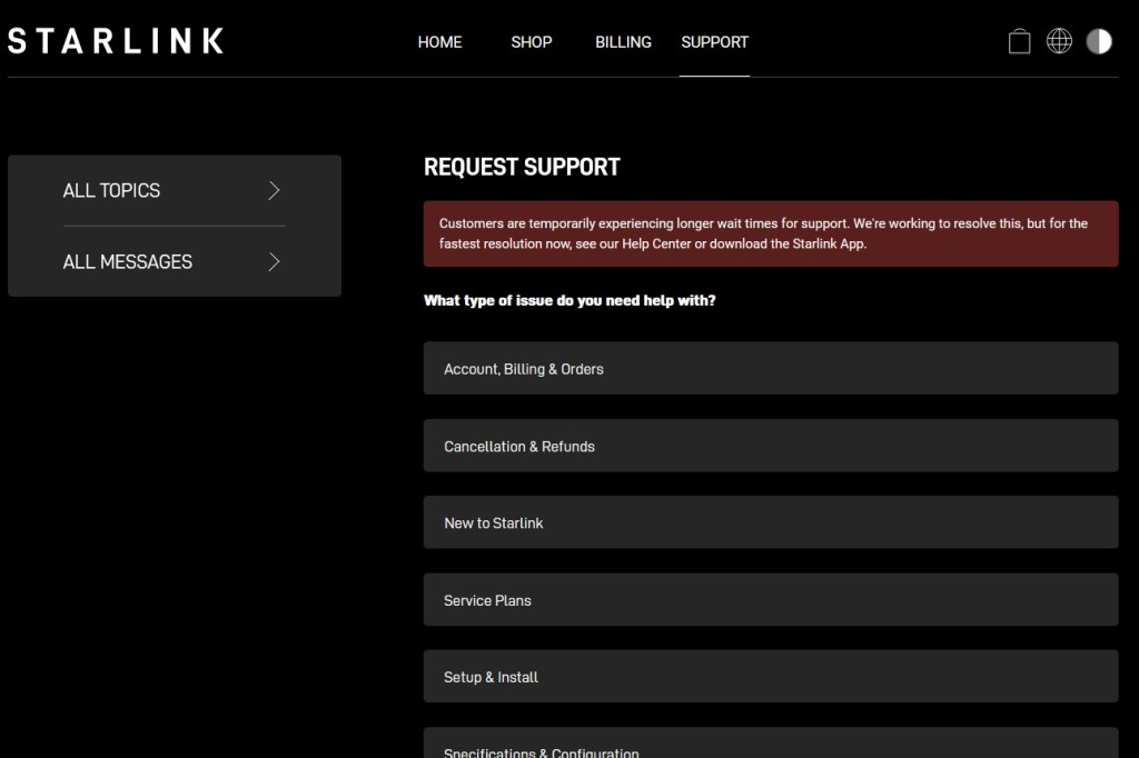 För att komma till sidan där man kan skicka ett meddelande till support, går man först till den här sidan. Se till att du är inloggad på ditt Starlink-konto i webbläsaren där du öppnar sidan. Är du inte det, är jag osäker på om du kan skicka meddelande.